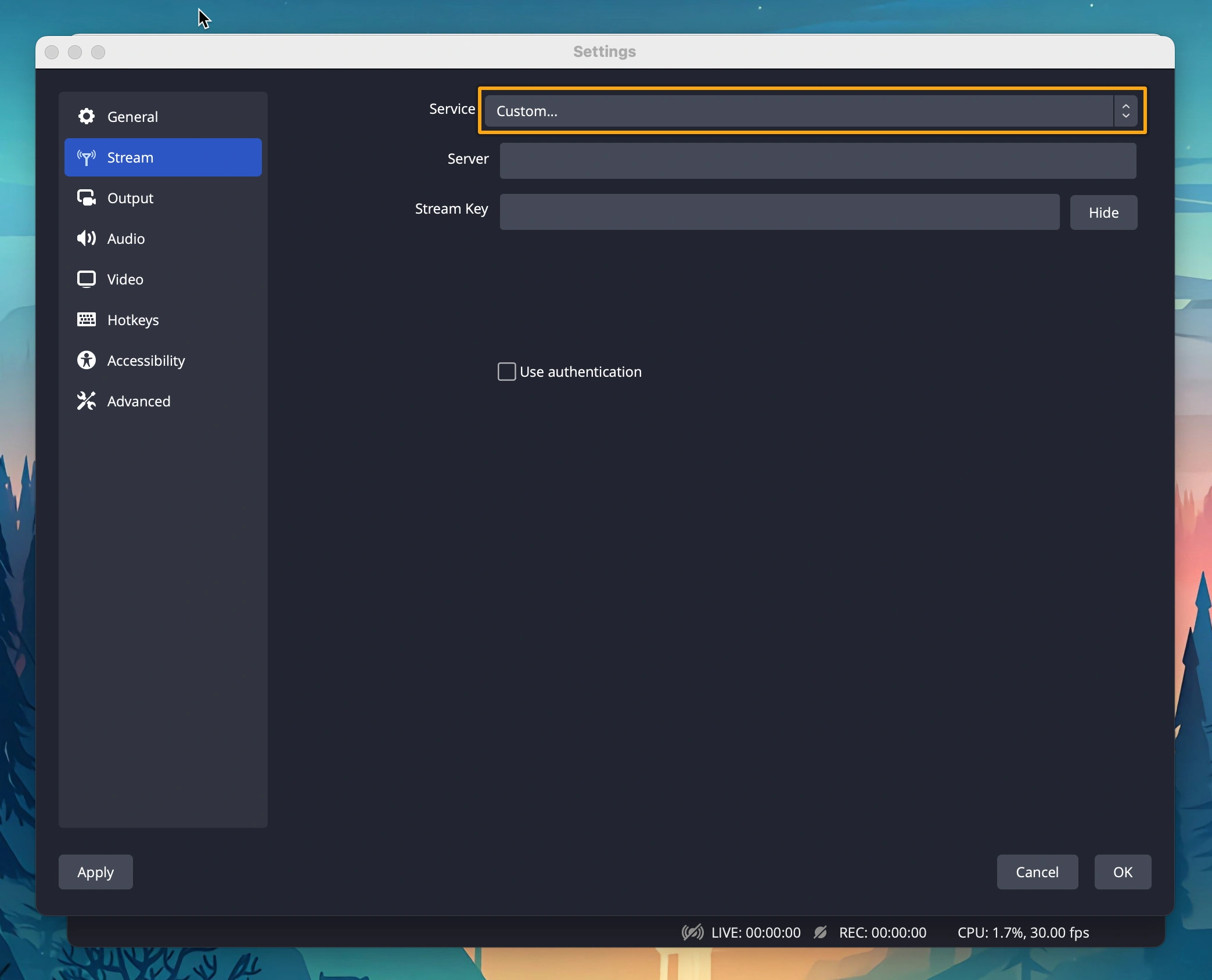 Being already in the Stream tab, we need to choose the right type of service. Switch the Service option to Custom.