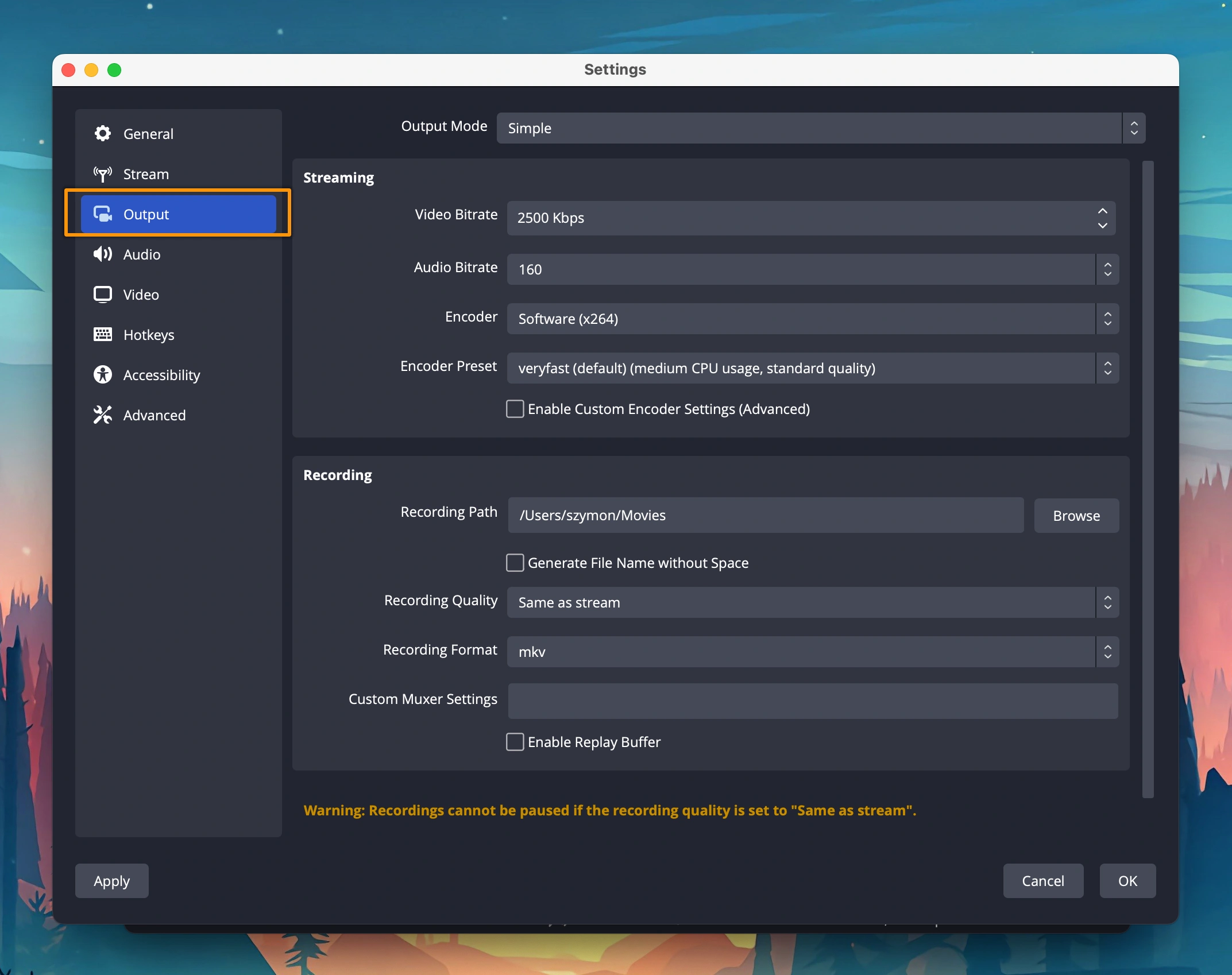 Set the correct video resolution. Go to the Video tab. You will find two parameters: Base (Canvas) Resolution and Output (Scaled) Resolution. Set both to your target resolution. For FPS value we suggest to set it to 30.