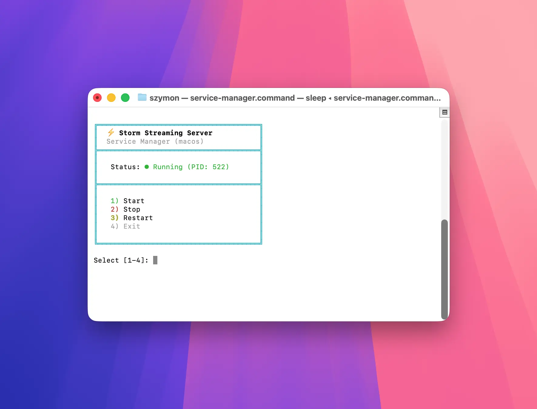 Since the application operates as a service by default, it will be started automatically with the system. In order to manage the service, you can use the simple command scripts included in the scripts folder called service-manager.command (by default in '/Applications/Storm Streaming Server/scripts').