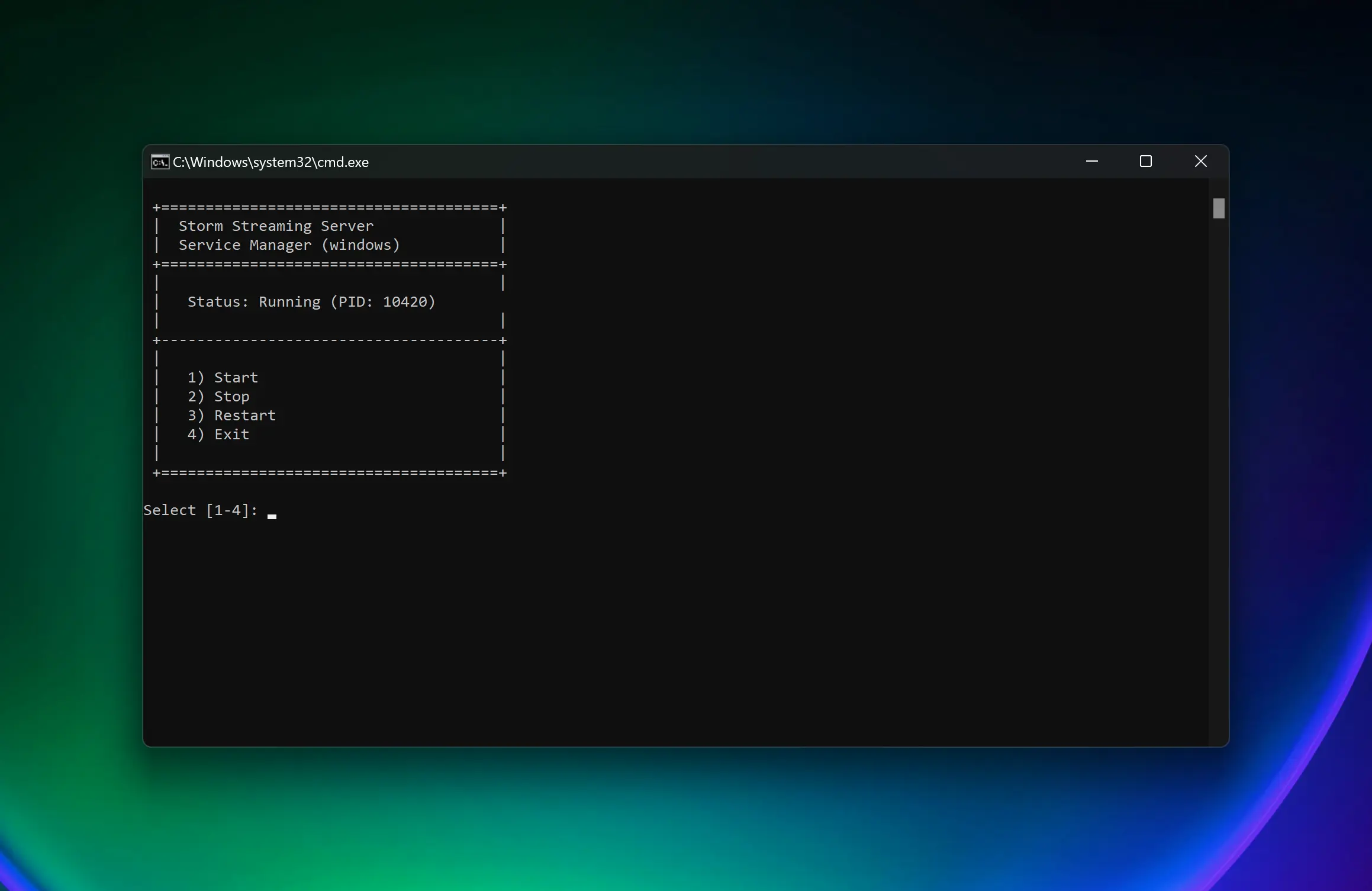 Since the application operates as a service by default, it will be started automatically with the system. In order to manage the service, you can use the simple bat scripts included in the scripts folder called service-manager.bat (by default in 'C:\Program Files\Storm Streaming Server\scripts').