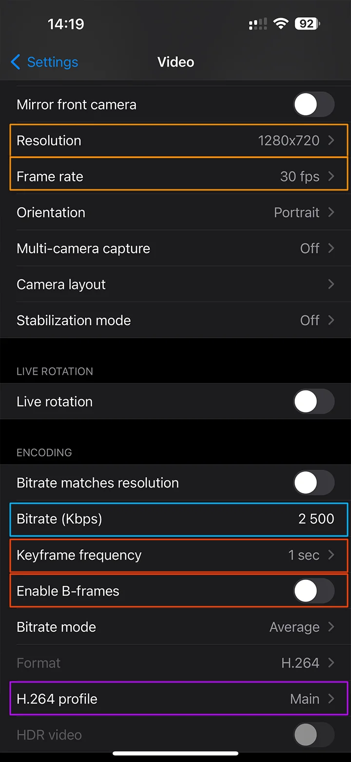 Resolution FPS Bitrate 1920x1080 60 6000 1920x1080 30 4500 1280x720 60 4500 1280x720 30 3000 Enable B-frames - off