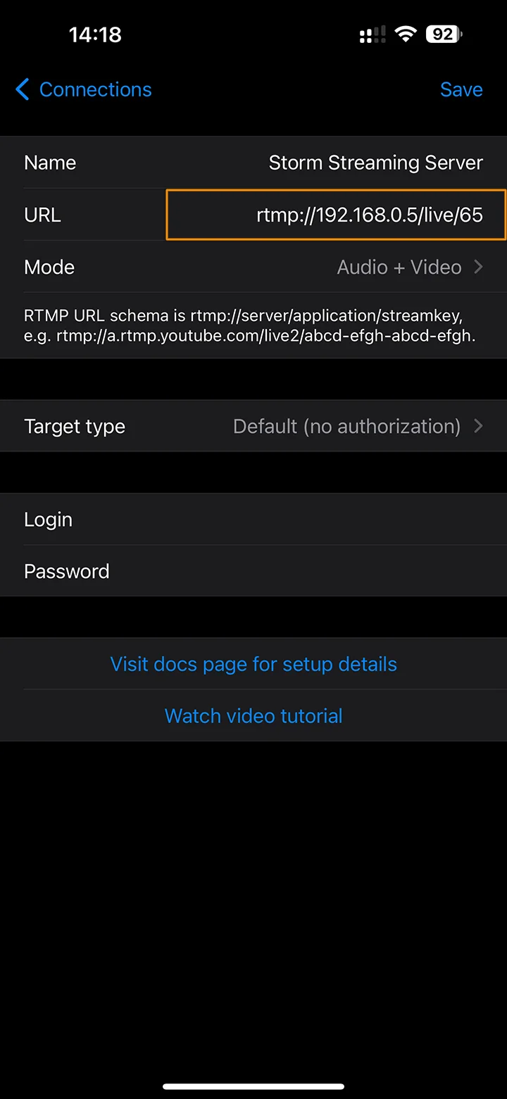 If your Storm application is configured in open mode, the server will accept any stream key and create a stream for you. For managed mode, you'll need to define login credentials and enable authentication on the Larix side. For that, pick "RTMP Authorization" under Target type, which will appear once the URL is in place. Now, all you have to do is provide a username (Login) and a password.